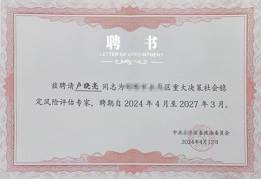 根据中共河北省委政法委《河北省重大决策社会稳定风险评估专家库管理办法(试行)》(冀政法〔2023〕28号),经单位推荐、个人自荐、资格审核等程序,经公示,卢晓亮律师受聘为该区重大决策社会稳定风险评估专家库入库专家,聘期三年,自2024年4月至2027年3月。